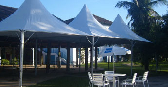 São coberturas em lonas anti-chamas, com a sua estrutura em metalon e calhas para escoamento de água de chuva em diversos tamanhos (3x3m / 4x4m / 5x5m / 10x10m); a lona pode ser branca e cristal (transparente).